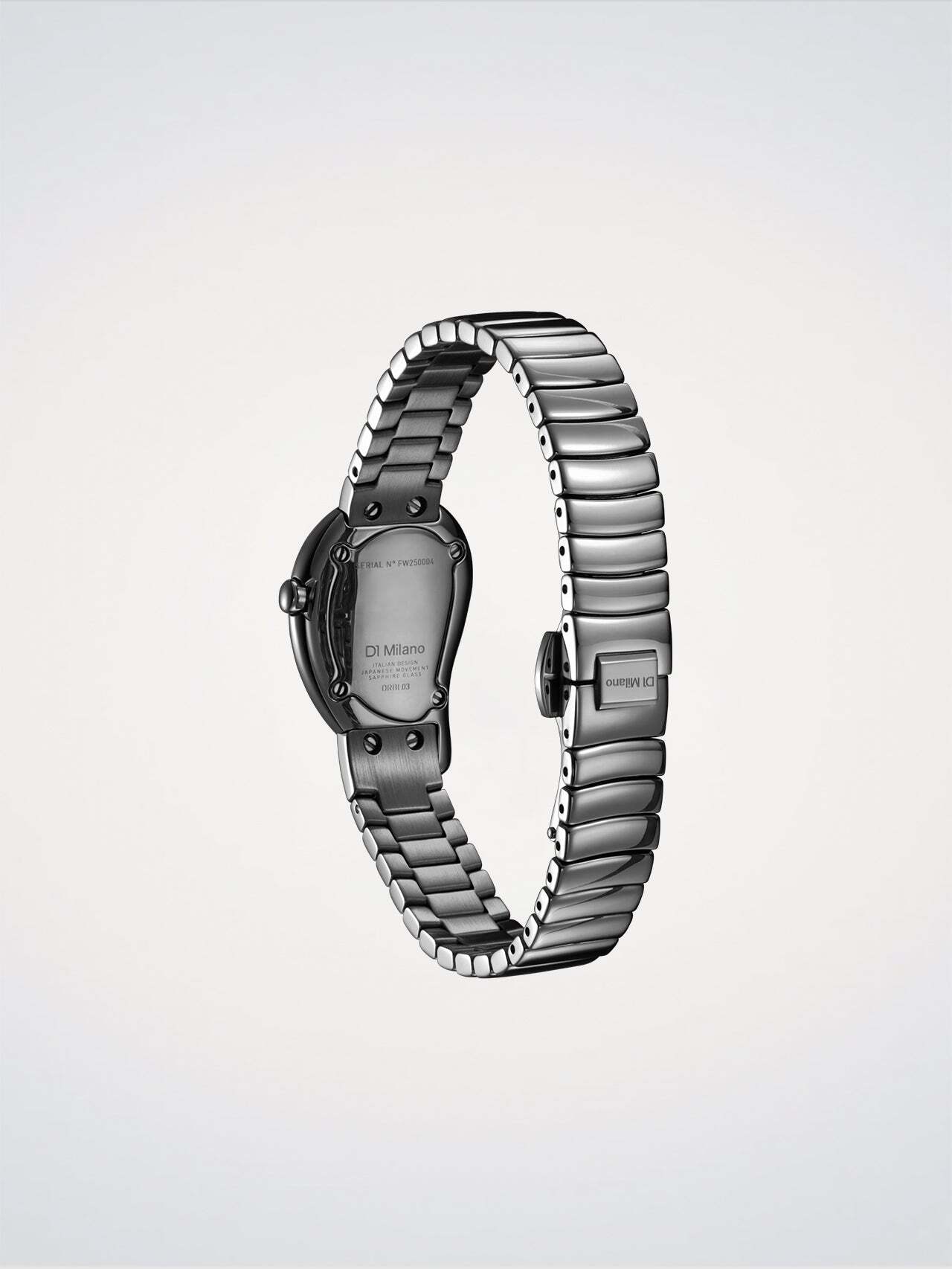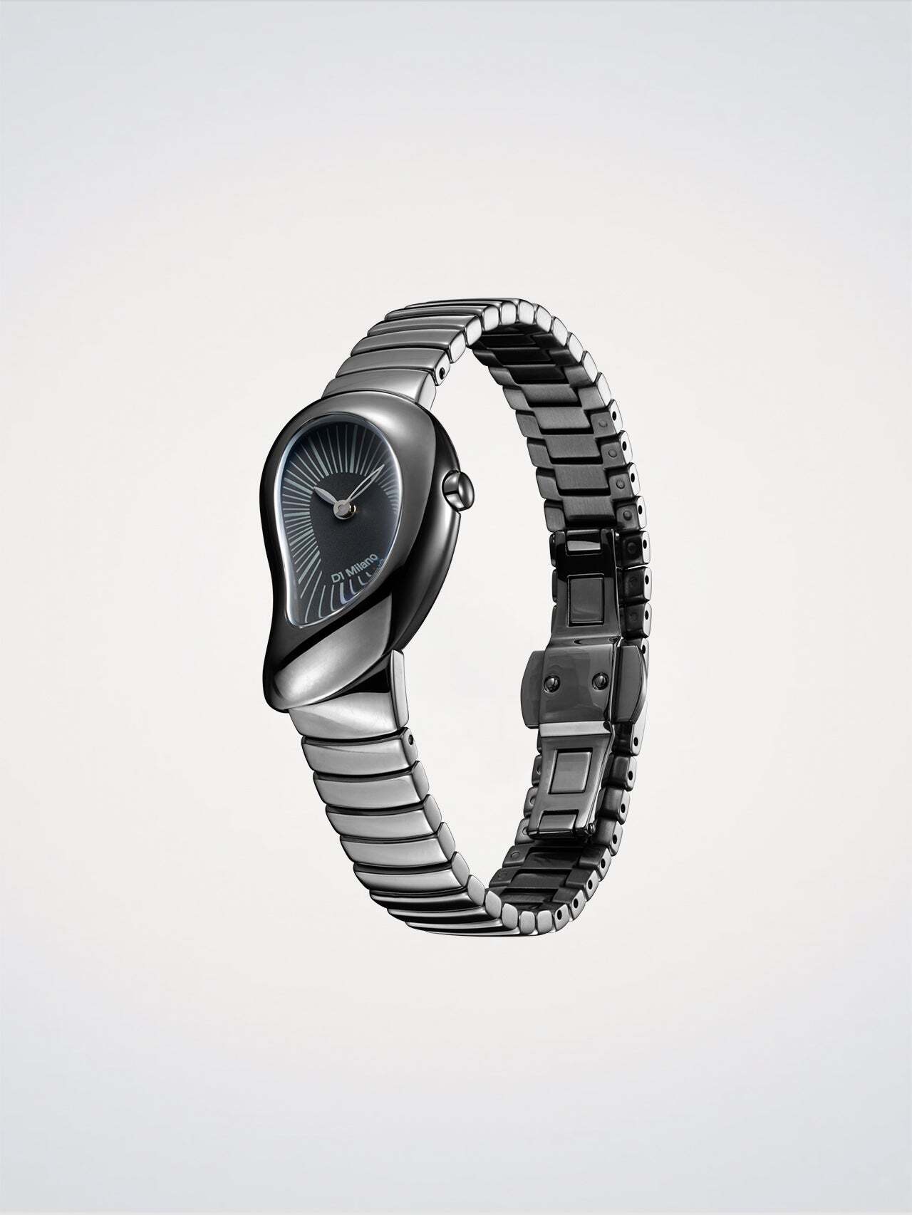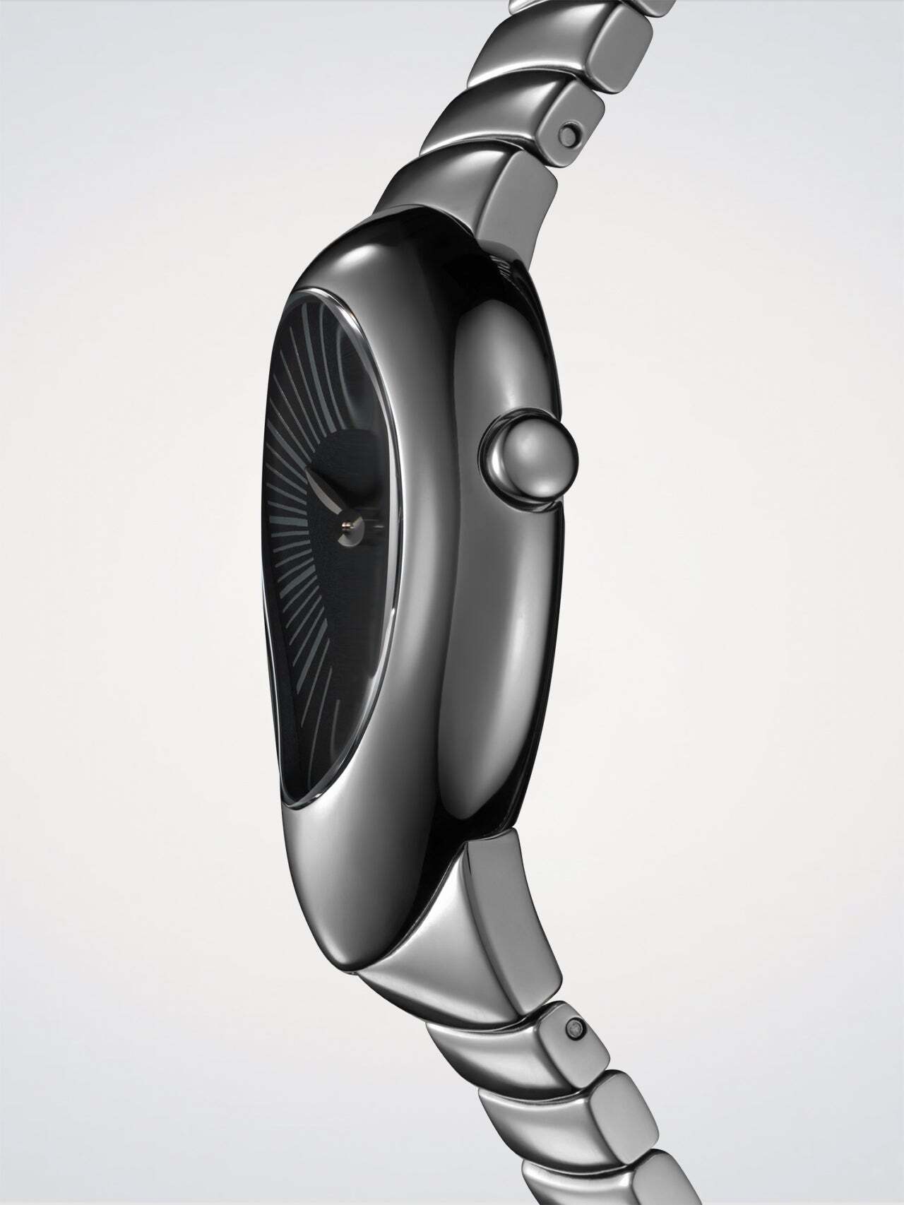 Плавні лінії та органічні об'єми визначають корпус, який порушує правила симетрії. Метал тече, як рідина, формуючи м'який та обволікаючий силует з нержавіючої сталі з чорним PVD-покриттям.