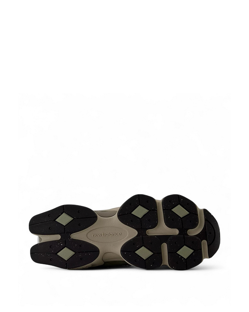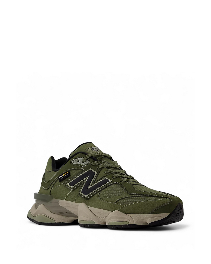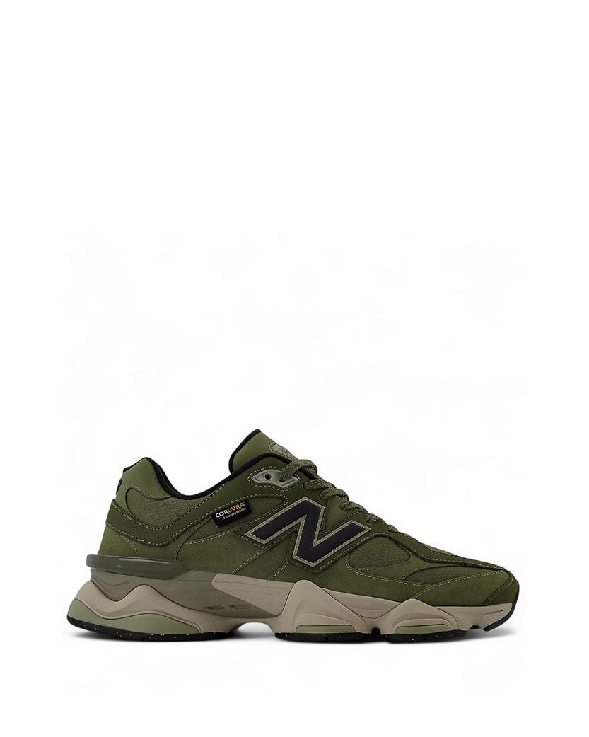 Верх кросівок New Balance 9060 Cordura Dark Olivine виготовлений зі шкіри та синтетичних матеріалів та посилений тканиною Cordura®, яка відрізняється високою стійкістю до пошкоджень.