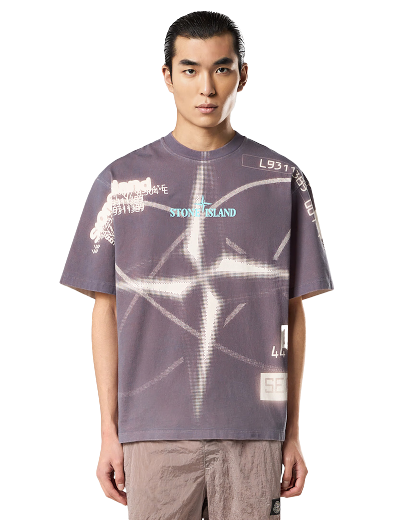 - Суцільний принт «Y2K Compass One» зі стилізованими літерами Stone Island та компасом, виконаний за допомогою культової техніки Stone Island «Luce».