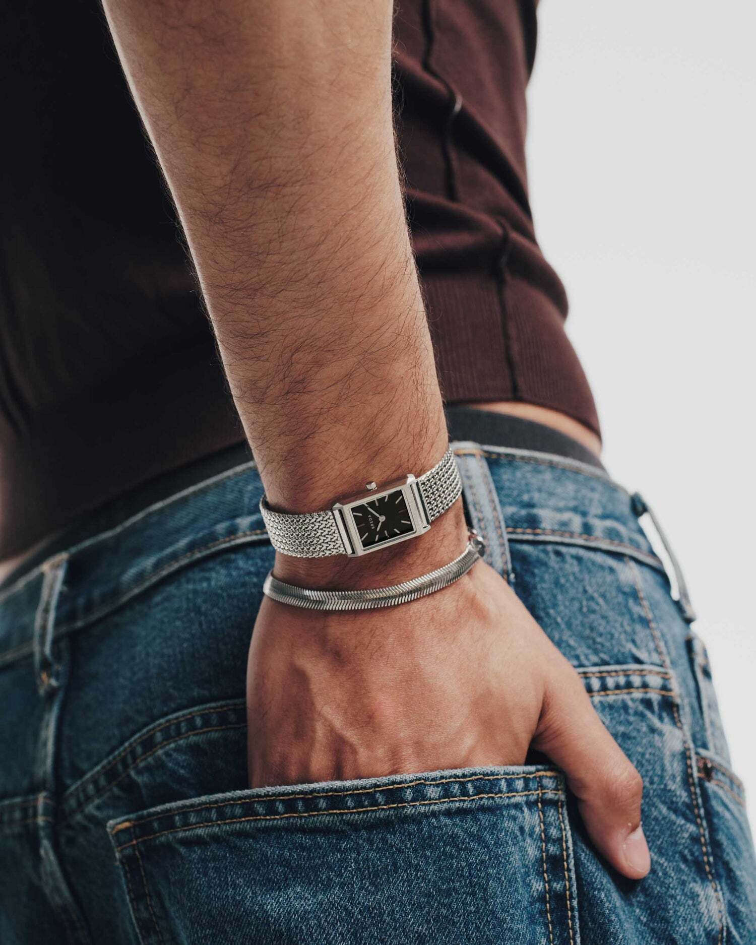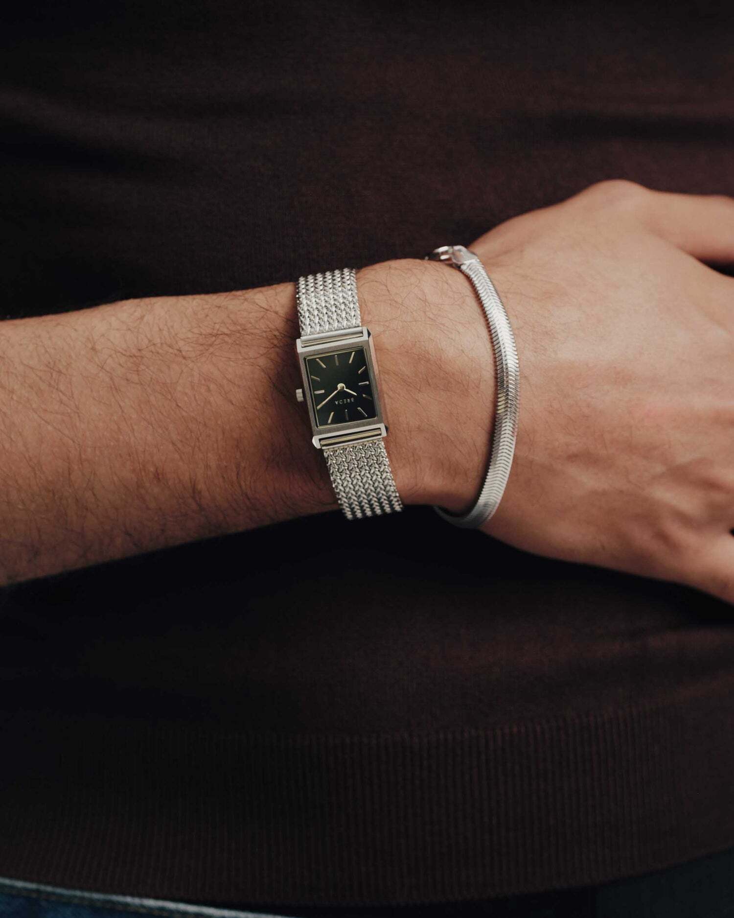 Колекція Tethered існує як щоденне нагадування про наш людський зв'язок і наші спільні спогади, що переплітаються і нескінченно зливаються воєдино. Модель Virgil (Tethered) Small має більш компактний 20-міліметровий прямокутний корпус і доповнена матовим циферблатом опівнічного кольору з плетеним сітчастим браслетом, який застібається за допомогою швидкороз'ємної застібки.
