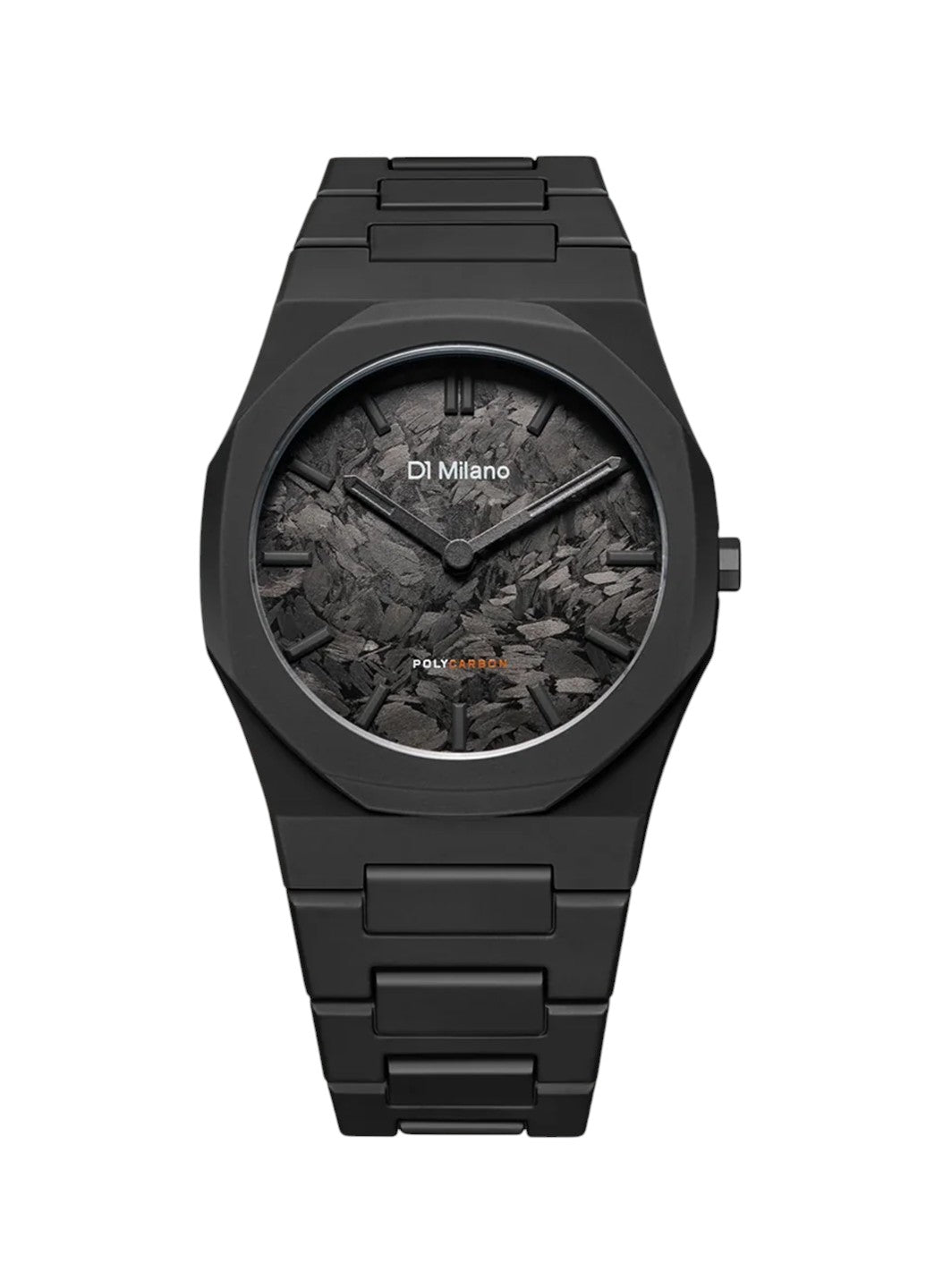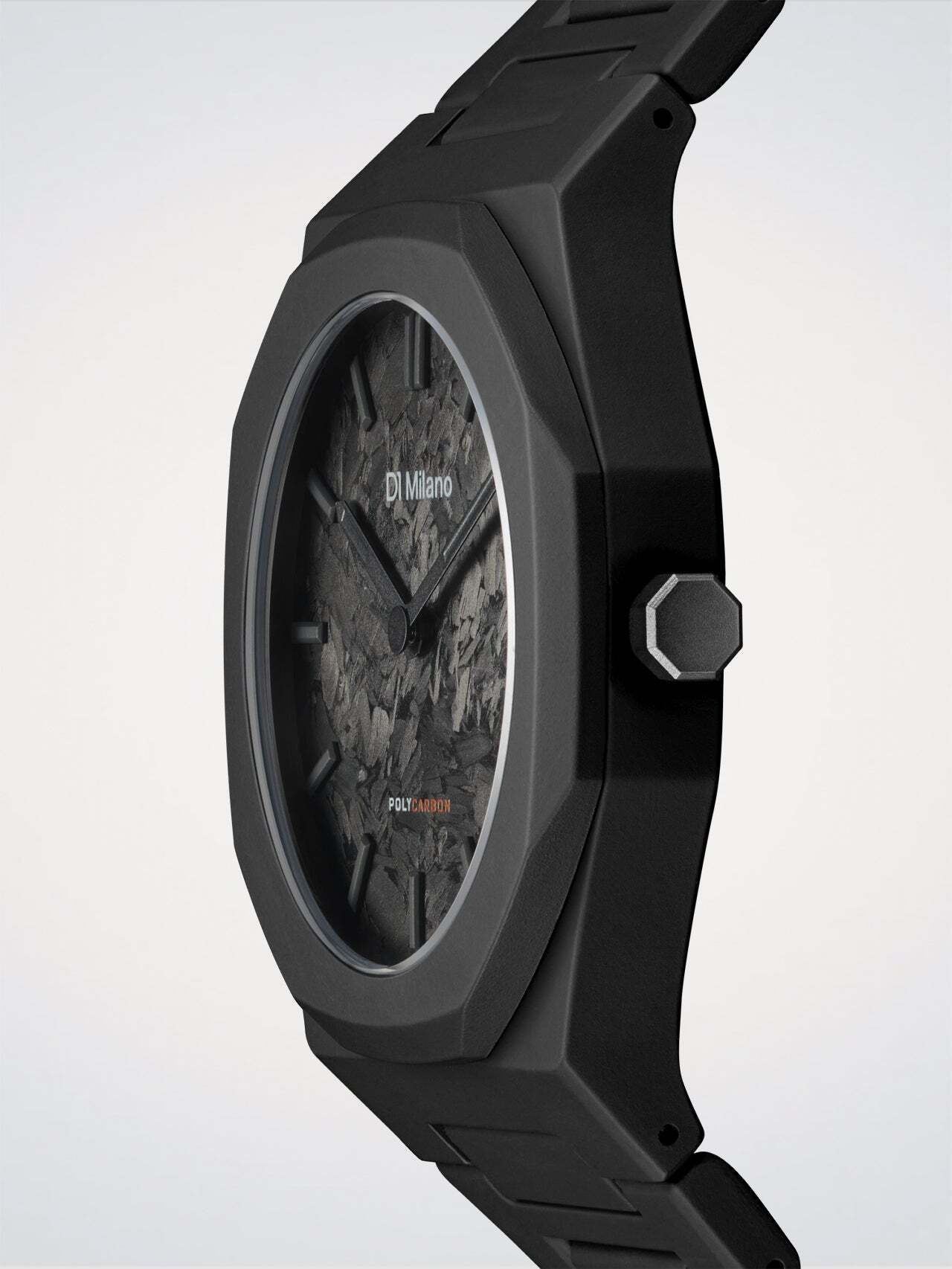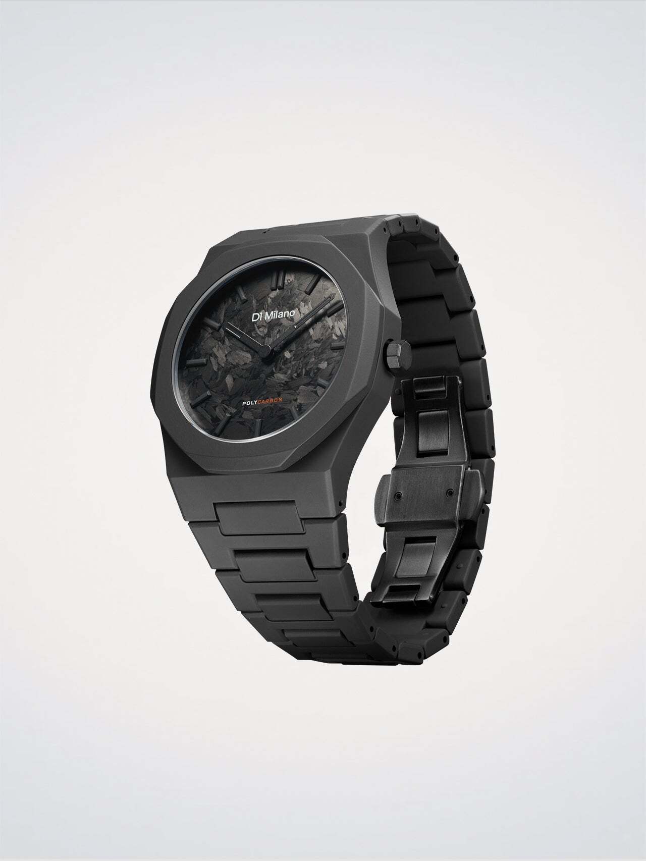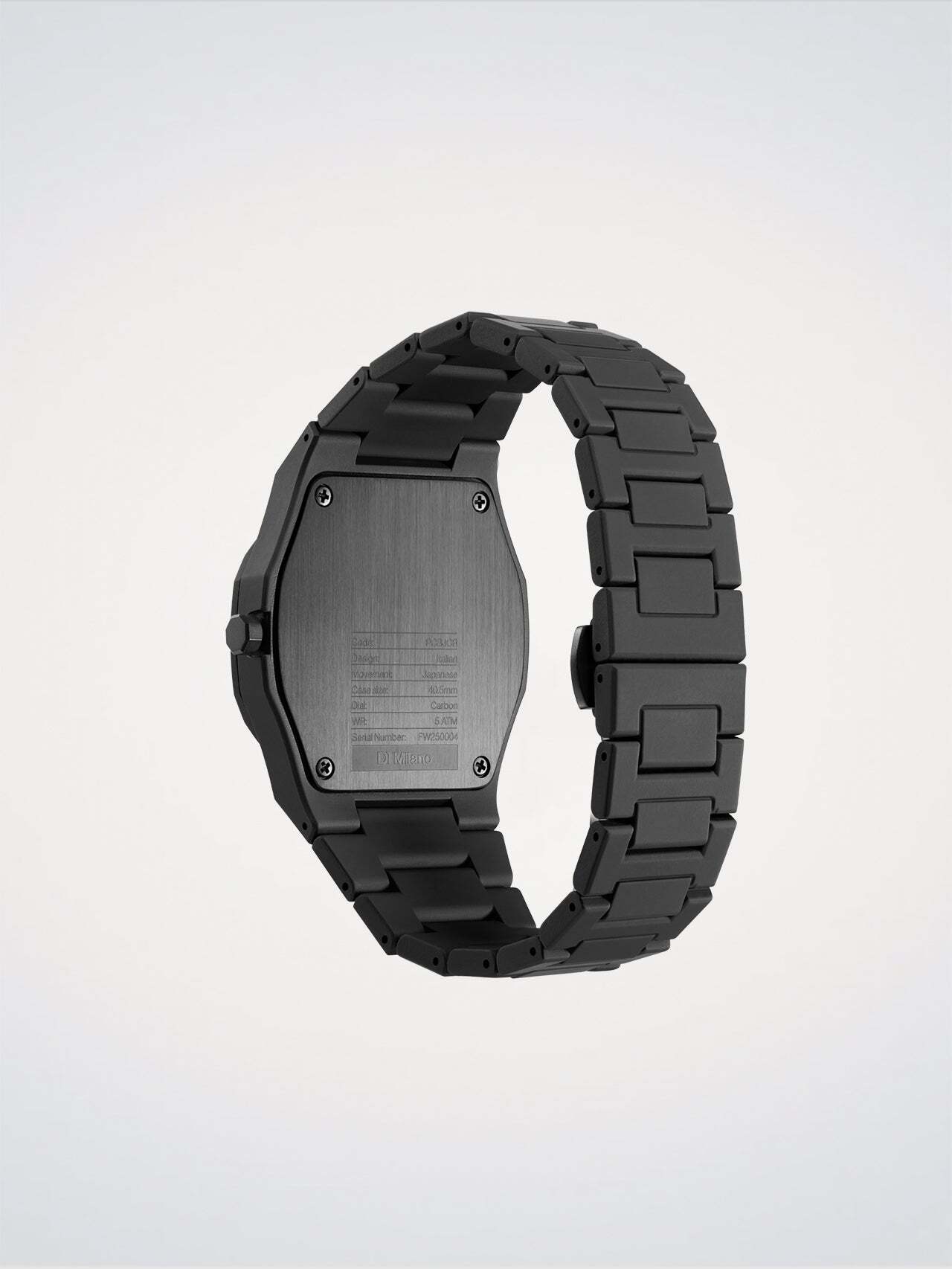 М'який ремінець і надзвичайно ергономічний матовий чорний корпус з полікарбонату забезпечують виняткову легкість на зап'ясті, а циферблат з натурального вуглецевого волокна з багатою текстурованою поверхнею додає виразного і високотехнологічного штриху.
