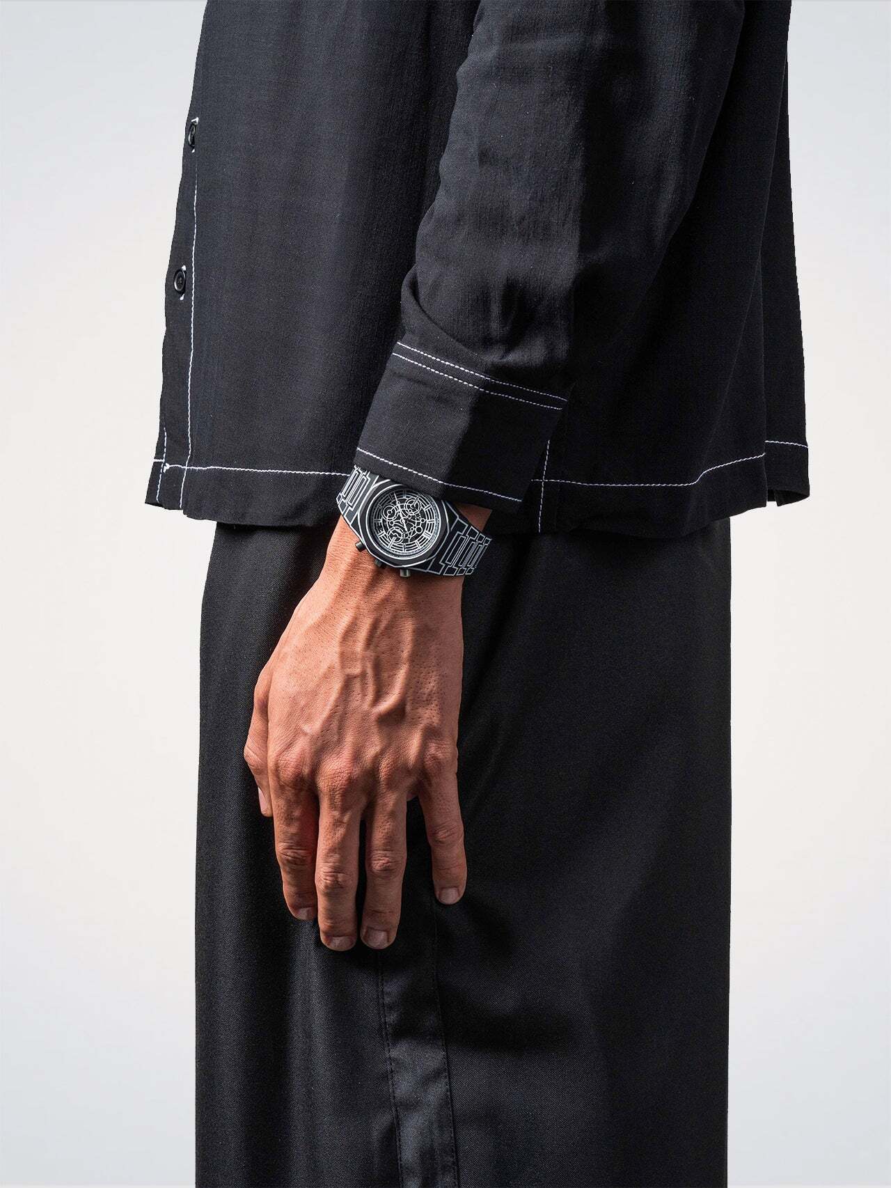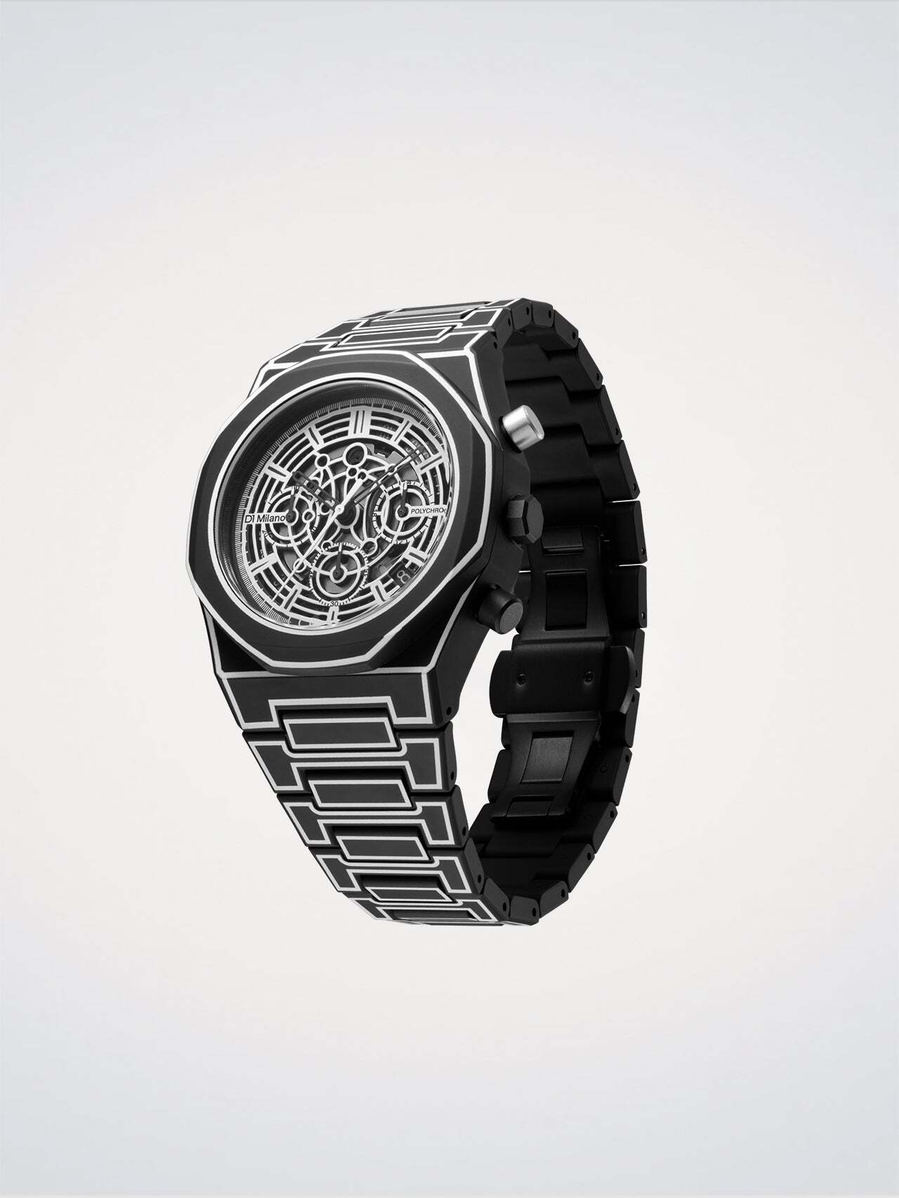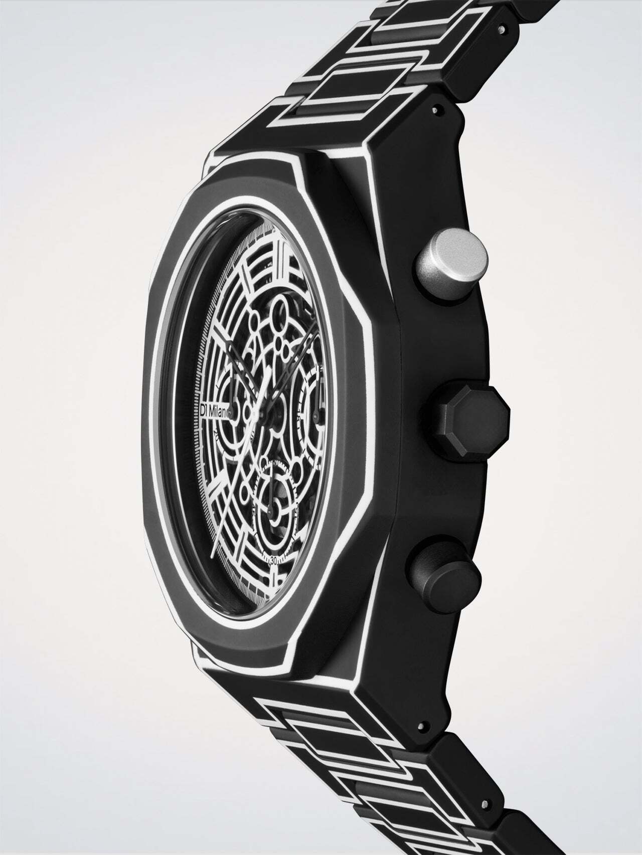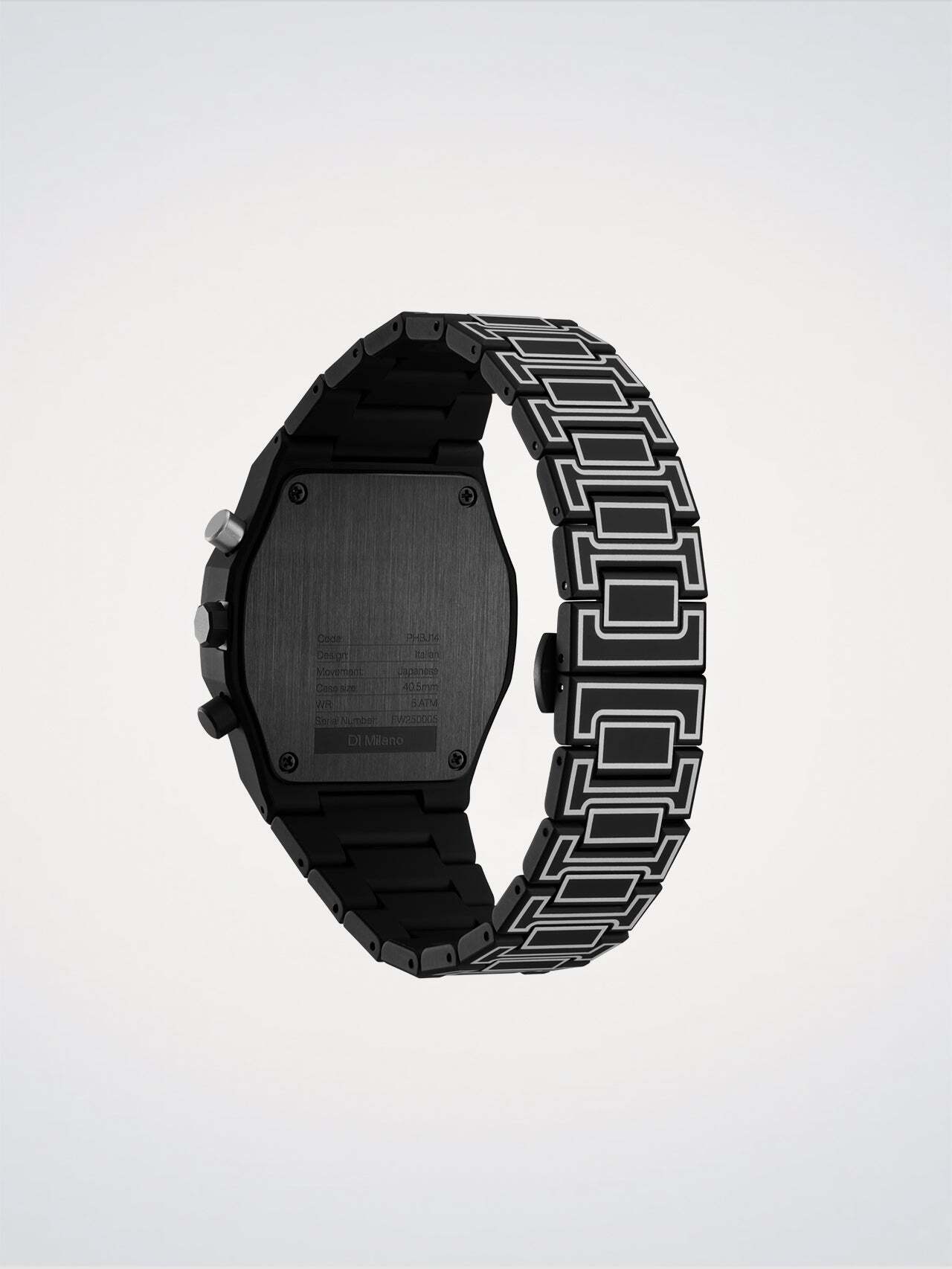 Виготовлені повністю з полікарбонату з повністю чорним м'яким покриттям, корпус, безель та інтегрований браслет покриті витонченими ілюстрованими контурами, що повторюють силует годинника.