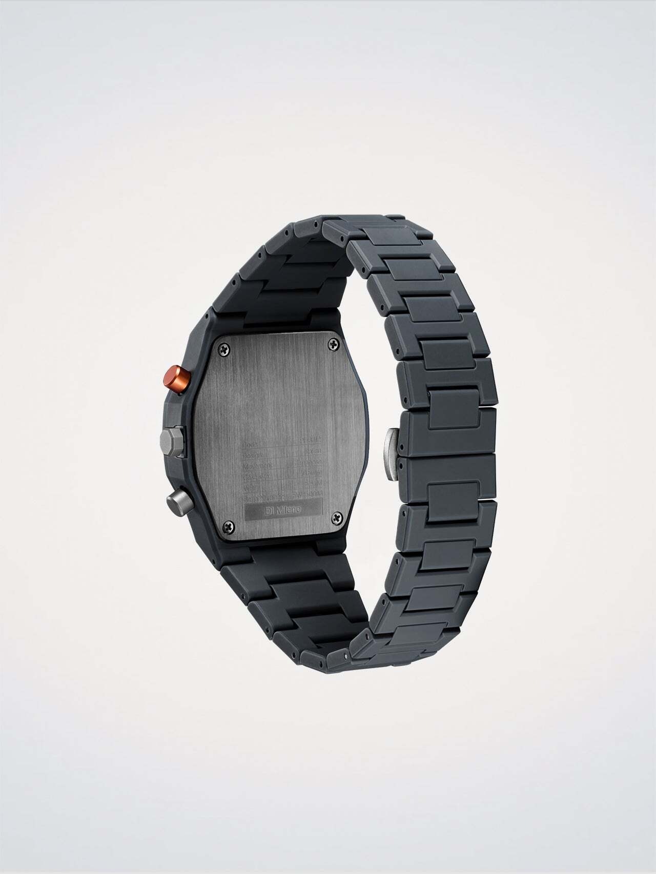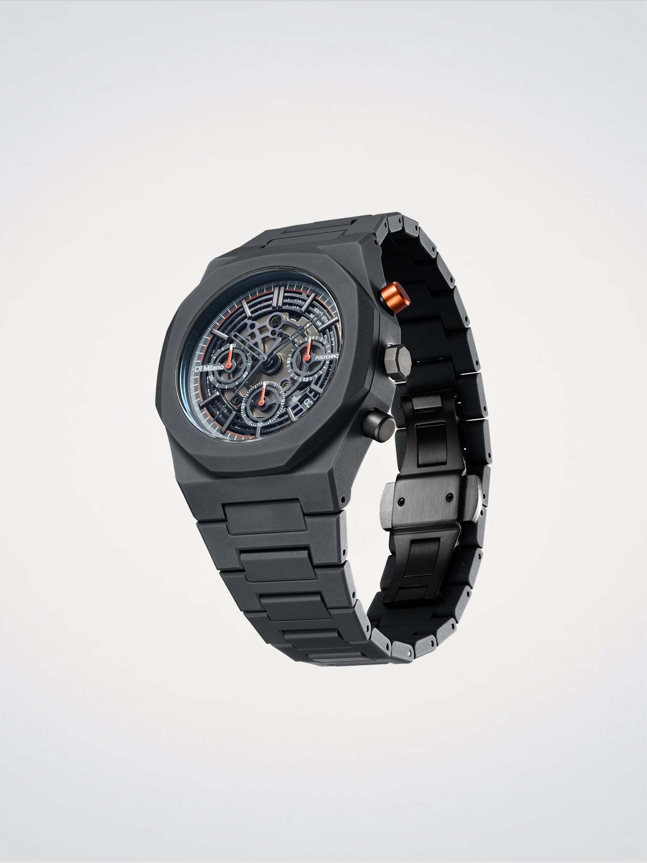 Темно-сіра монохромна гама підкреслена скелетон-циферблатом, що делікатно відкриває механізм усередині, надаючи глибини й технічної виразності. Модель оснащена корпусом діаметром 40,5 мм, безелем і браслетом, виконаним з ультралегкого полікарбонату зі шовковисто-м’яким покриттям.